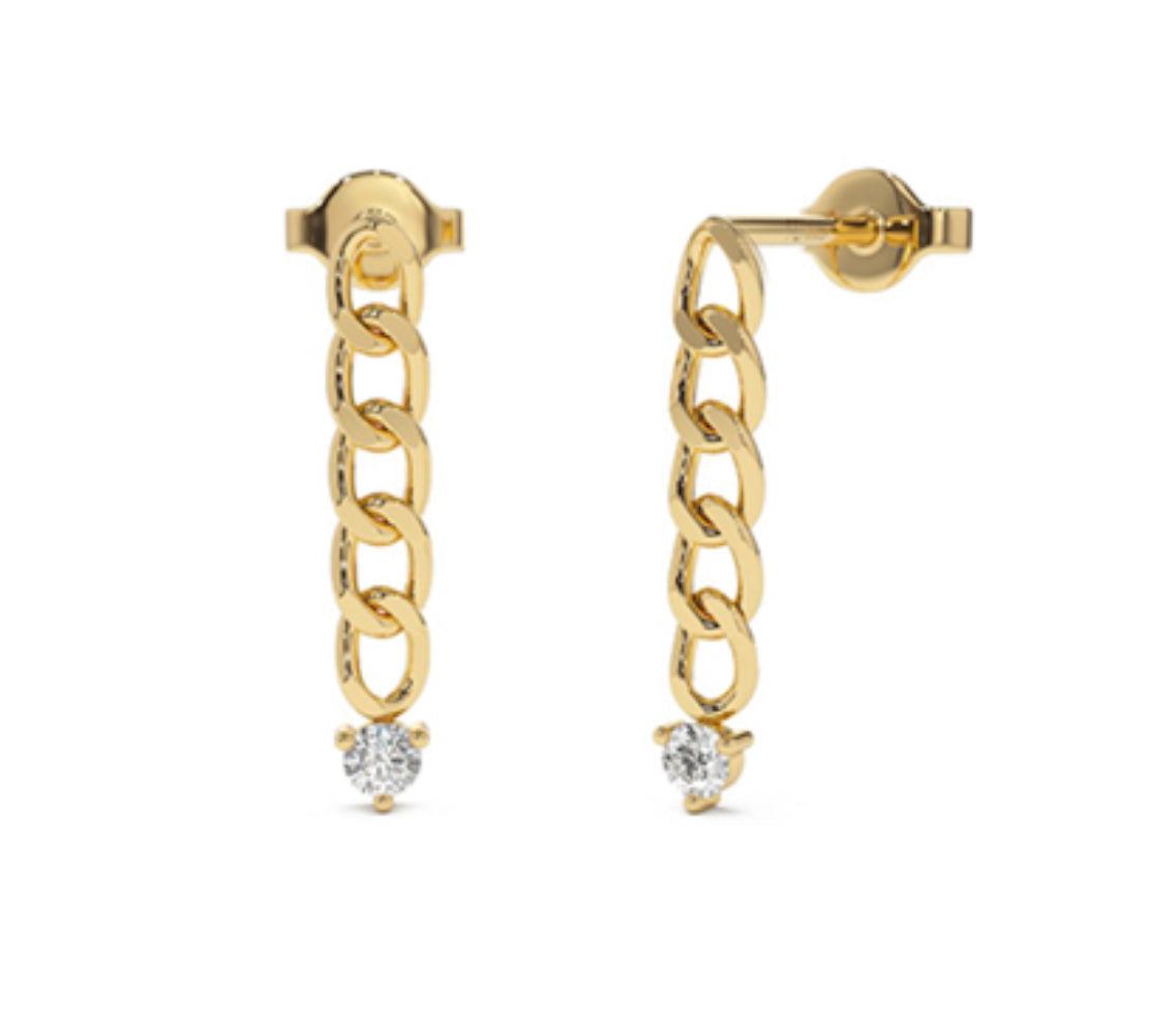 - Drop earrings featuring polished gold chain links and white CZ stones